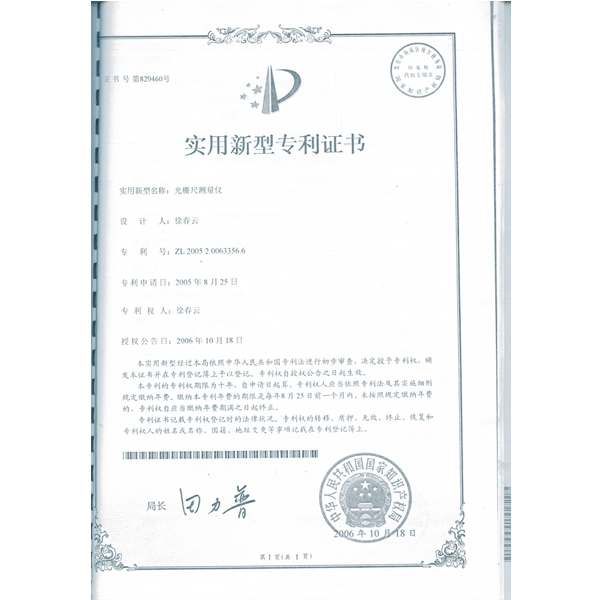 光柵尺測(cè)量?jī)x專利證書