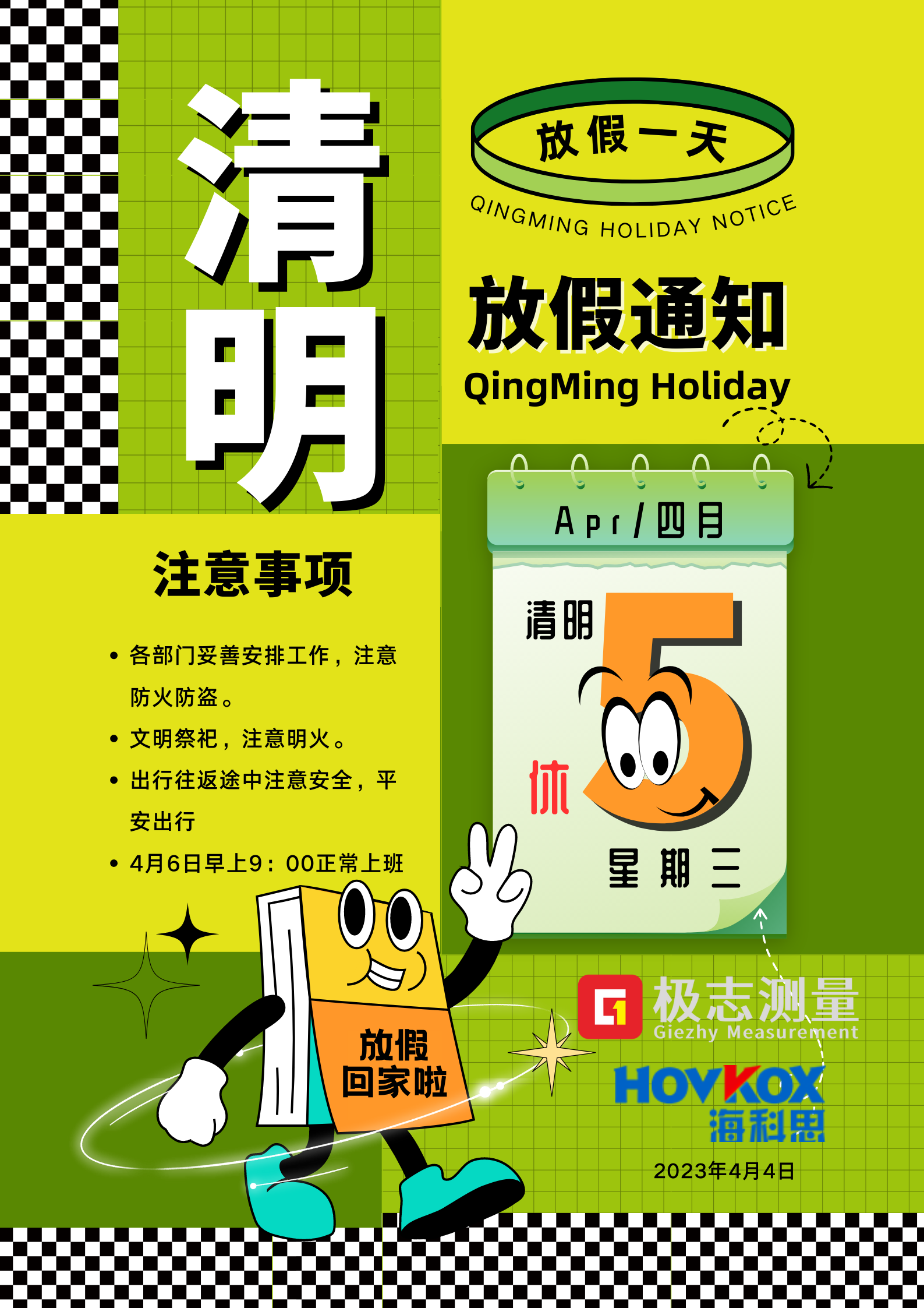 2023年4月5日(星期三)共放假一天,2021年4月6日(星期四)正常上班!