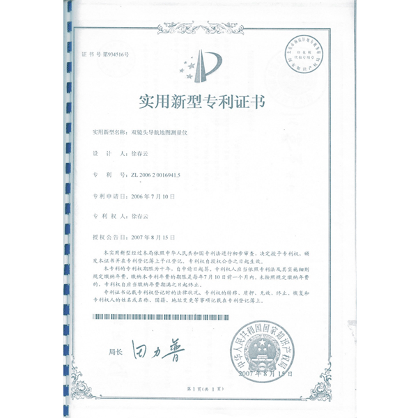 雙鏡頭導(dǎo)航地圖測(cè)量?jī)x專(zhuān)利證書(shū)