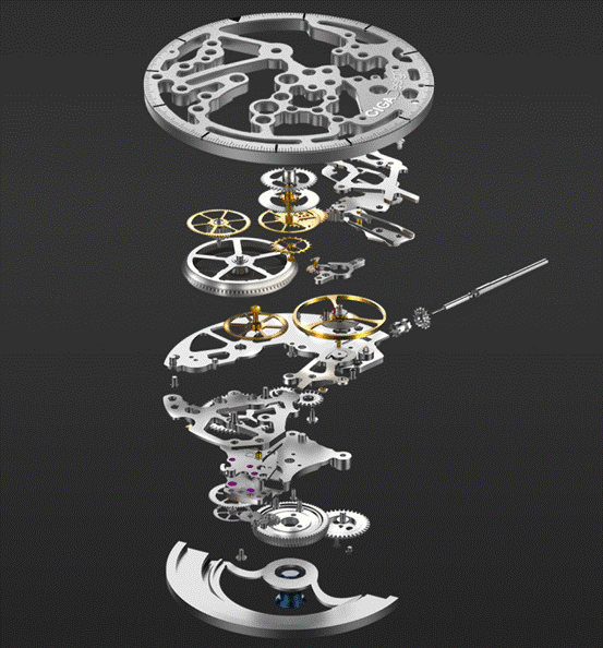 這款手表核心由一元硬幣大小的機(jī)芯共有94個零件去組合而成,精密的結(jié)構(gòu)擁有精確的走時。如此精密的機(jī)械手表,是如何把齒輪、發(fā)條、調(diào)速器等等所有的零件都被集中于尺寸只有硬幣大小的表殼里,任何一處零件誤差都會造成手表走時精確的影響,如齒輪齒口誤差、兩個齒輪距離誤差、零件邊緣凹凸缺陷,這些問題都會導(dǎo)致手表停止運(yùn)作。